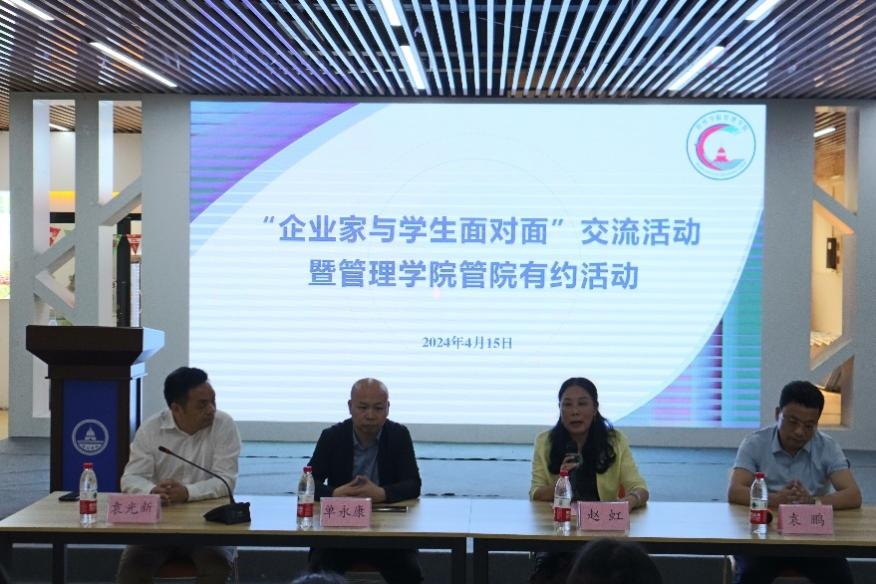 4月15日下午,管理学院在体育馆负一楼邑谷中心举办第六期“我与企业家面对面”暨“管院有约”活动。本次活动由副院长赵虹主持,出席本次活动的企业家包括海元商业运营管理有限公司创始人、董事、总经理单永康,海元商业运营管理(四会)有限公司董事、总经理袁光新,以及梧州顺鑫网络科技有限公司、广西梧州义信建筑工程有限公司总经理袁鹏,学院教师代表和学生代表参加了本次活动。
