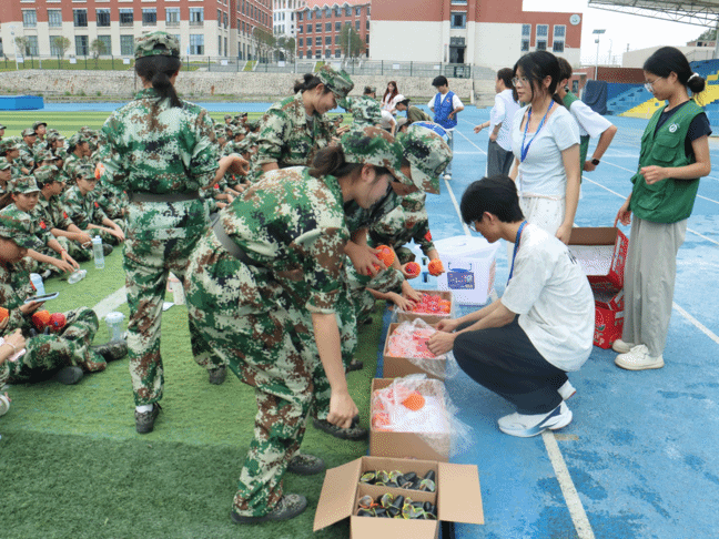 慰问期间,卓玮副书记还与学生干部一同为新生送上龟苓膏、水果等消暑慰问品。慰问活动不仅缓解了训练带来的疲惫,更传递了学院对同学们的关怀,让同学们在紧张的军事训练中感受到了管院大家庭的温暖。