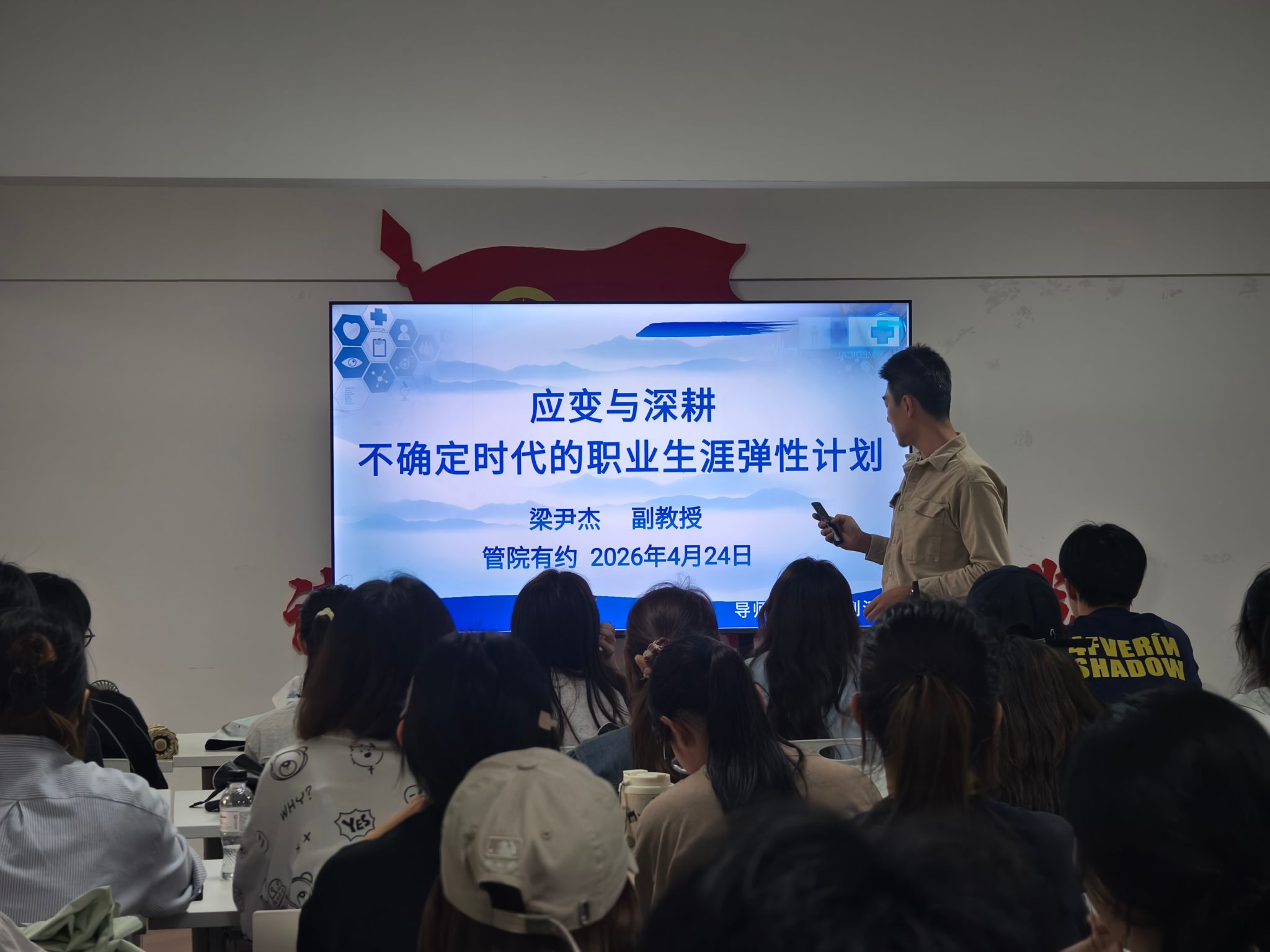 为帮助学生锚定职业方向,破解成长焦虑。4月24日,管理学院在“一站式”学生社区服务中心开展职业生涯规划主题讲座。主题讲座。供应链管理专业教研室主任梁尹杰副教授以“应变与深耕—不确定时代的职业生涯弹性计划”为题,与同学们分享经验。