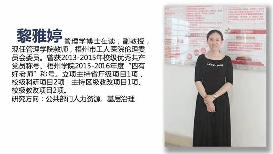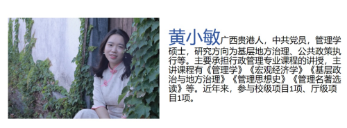 陈花,女,梧州学院管理学院讲师,厦门大学行政管理专业博士研究生,研究方向为公共部门人力资源管理与基层治理创新。任职期间主要讲授的课程包括人力资源管理、组织行为学、绩效管理、社区管理等。具有助理会计师职业技术资格和Python技术应用工程师职业技术证书,自2022年以来连续担任梧州市消防救援支队特约研究员,获第五届梧州学院青年教师教学竞赛二等奖,梧州学院2017-2018年度四有好老师称号。近年来主要承担和参与的科研项目包括国家级1项、省部级1项,市厅级2项,校级重点项目2项,公开发表论文多篇。指导学生参加大创项目、正大杯、寻是杯等学科竞赛,获第二届贵州省大学生大数据与公共决策模拟大赛总决赛一等奖优秀指导老师。