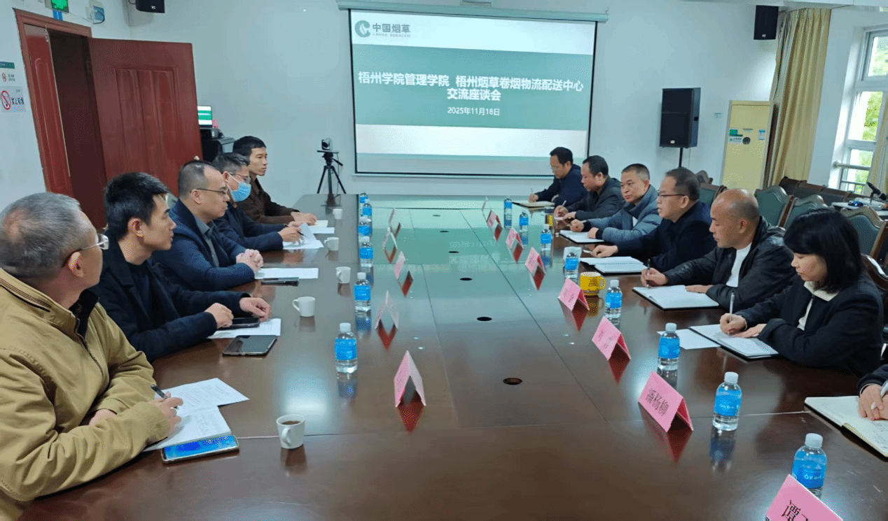 此次交流是管理学院深化校地校企合作、主动对接企业需求的具体行动。座谈会上,双方围绕梧州卷烟物流配送中心面临的工作痛点展开深入交流,探讨了备品备件管理与资源共享优化、降低配送破损率、提高客户满意度等企业关注的问题。
