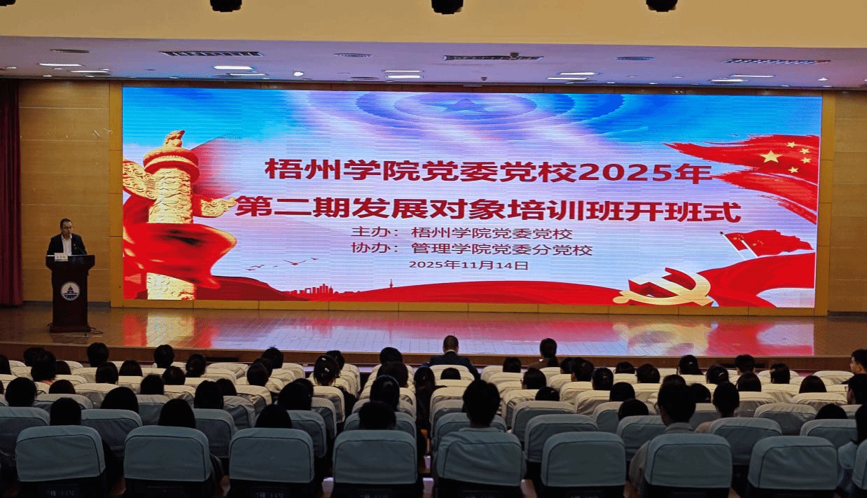 11月14日,梧州学院党委党校2025年第二期发展对象培训班正式开班。来自12个基层党委的258名发展对象参加培训。学校党委组织部副部长卢桂吉,管理学院党委书记朱宇乾、党委副书记卓玮出席开班仪式。