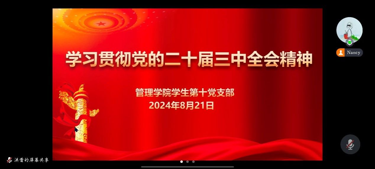 2024年8月21日,管理学院学生第十党支部在线上召开“学习贯彻党的二十届三中全会精神”的学习研讨会。
